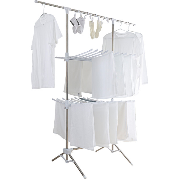 ●大容量のものほしスタンドです●上部の干し部は伸縮式なので丈の長いワンピ-スやズボンなども干せます●ピンチハンガ-4本は着脱式です●場所をとらないコンパクト収納