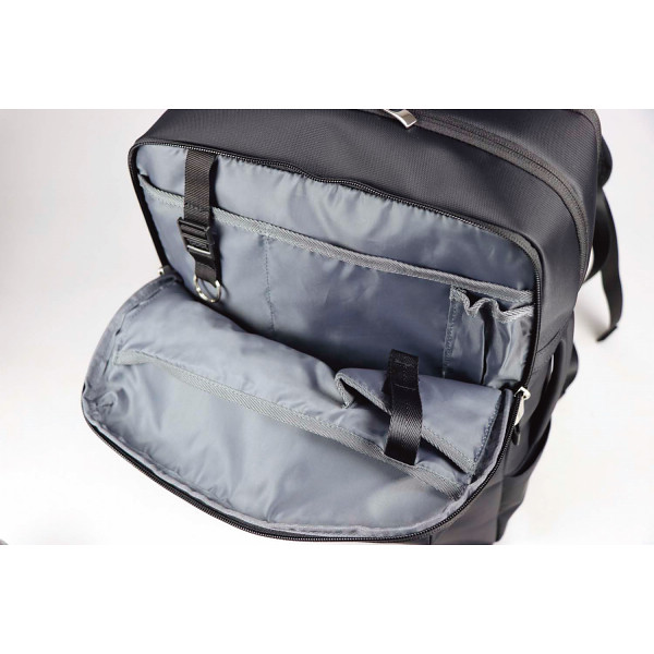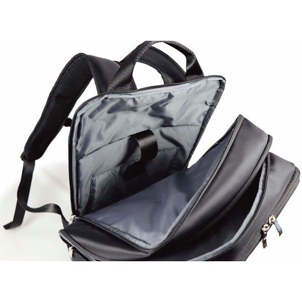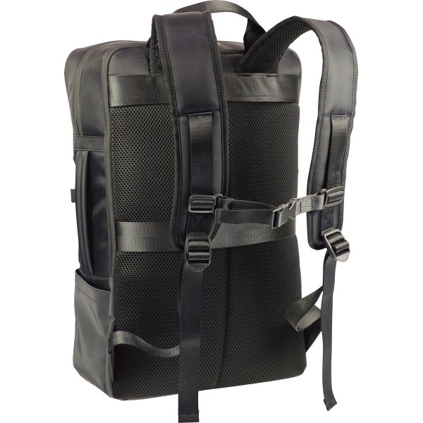PC収納機能付きでB4ファイル収納サイズのビジネスリュック。チェストベルトが付いてバッグが体にフィット。キャリーバッグ装着可能なループ付きで、内側に機能的なポケットが充実した出張にも便利なバッグです。