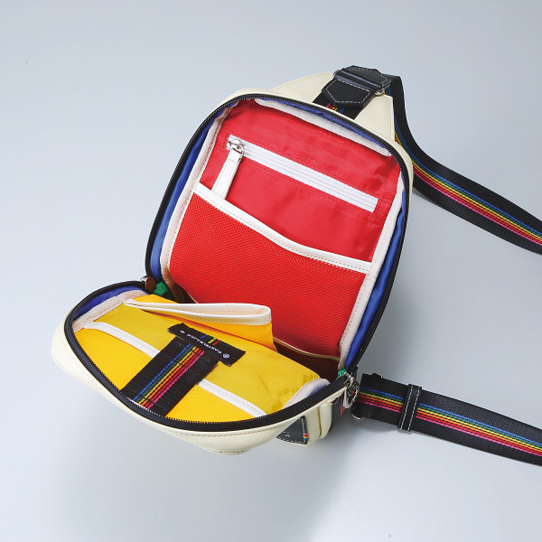 本体素材にはお手入れの簡単な合皮を使用しており、雨の日でも安心してお使い頂けるバッグです。カステルバジャックを象徴するレインボーカラーのテープがデザインのアクセントになっています。