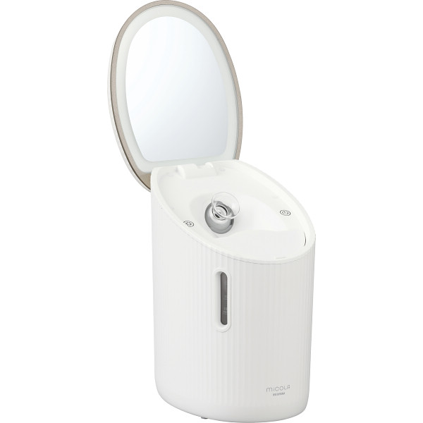 モイスト/クレンジング/メイクアップ機能搭載で、トータルスキンケアができます。調色可能なLED付きミラー搭載。ケア時に肌の状態を確認したり、その日の予定に合わせたメイクができます。150mlの大容量給水タンクなので、朝から夜まで補給なしでご使用いただけます。タンク窓目盛り搭載で、使用可能時間を一目で確認できます。タンク下の水残りの排水もボタンを押すだけで排水できるため、楽なお手入れで清潔にお使いいただけます。