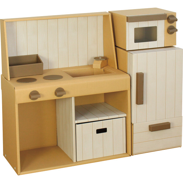 ダンボールでできた子供のままごと冷蔵庫とレンジとキッチンのおもちゃセット。ツマミがくるくる回り、扉はマグネット付なので本物のみたい。ダンボールの切り口はウェーブ刃を使用して波状になっているので手が切れにくい工夫がされています。