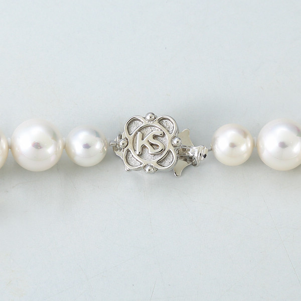 ホワイトとグレーの2色、4点セット。貝パールの中でも特に輝きの美しい珠を使ったネックレスセット。すべての珠と珠の間にシリコンを挿入し、ワイヤーで組み上げた高級な仕上げです。