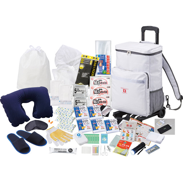 内容:リュックバッグ・折りたたみキャリー・9光LEDライト(単4電池×3本使用・別売)・モバイルチャージャー(単3電池×4本使用・別売)・ホイッスル・防寒アルミシート・防災ハンドブック・給水袋(3L)・レインコート・長期保存ボディタオル・軍手・首枕・アイマスク・耳栓・スリッパ・衣類収納袋・エイドチーム2(ハサミ・爪切り・毛抜き・絆創膏・綿棒・ワンタッチホータイ・コットンパフ・収納ケース)×各1、ウェットティシュ(20枚)・マスク×各2、カイロ・ポケットティッシュ×各3、緊急携帯トイレ1P×5