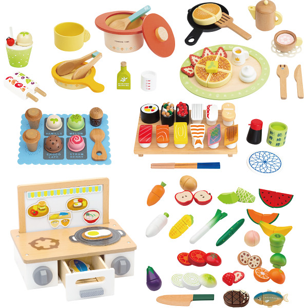 内容:具材×22、包丁/パンケーキ×2、シロップ、ホイップ、スライスいちご×4、ポット、ティーカップセット、バター、スキレット、フライ返し、フォーク、ナイフ、プレート/アイス×5、トッピング、サーバー、コーン×2、ソーダ、ストロー、アイスバー/すし×12、すし下駄、しょうゆ、小皿、箸、湯呑、メニュー、キッチン(グリルつき)、ボード、マグネットシート×9、おなべ、ふた、フライパン、スープカップ、オイル、計量カップ、トング、おたま対象年齢3歳~