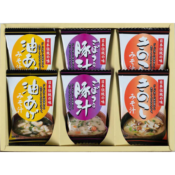 内容:お味噌汁(油揚げ)×2個、お味噌汁(きのこ)×2個、お味噌汁(豚汁)×2個