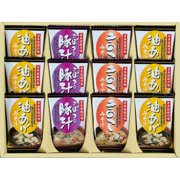 凍結乾燥の技術でお湯を注ぐだけでおいしさそのままのお味噌汁詰合せ。油揚げとわかめを使い、和風だしを効かせた定番の味噌汁(油揚げ)。3種のきのこを使い、米みそと豆みそをブレンドした風味豊かな味噌汁(きのこ)。豚肉と野菜の旨味にごぼうの食感がマッチした、コク深い味わいの豚汁。お味噌汁3種の味詰合せです。