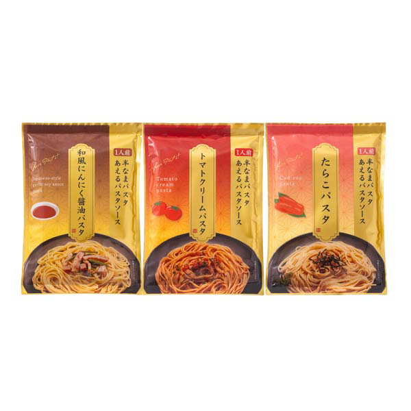 内容:和風にんにく醤油パスタ(めん100g、ソース30g)×1袋、トマトクリームパスタ(めん100g、ソース28g)×1袋、たらこパスタ(めん100g、ソース30g)×1袋