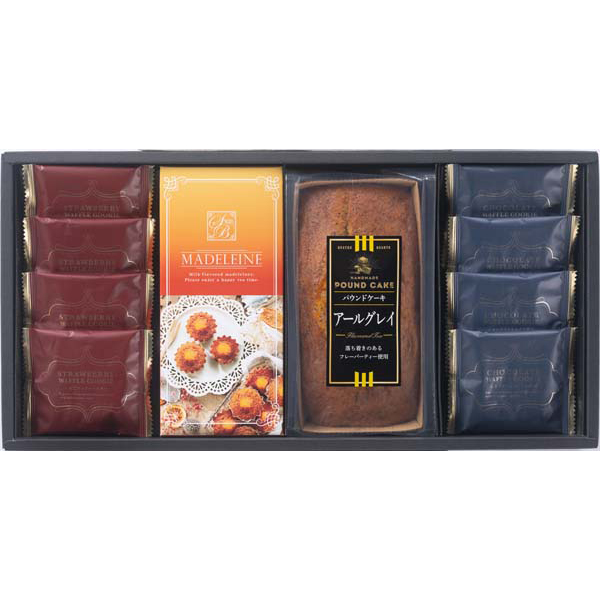 内容:パウンドケーキ(アールグレイ)×1、マドレーヌ(ミルク×2)×1、ワッフルクッキー(ホワイトショコラ)×4、ワッフルクッキー(いちご)×4