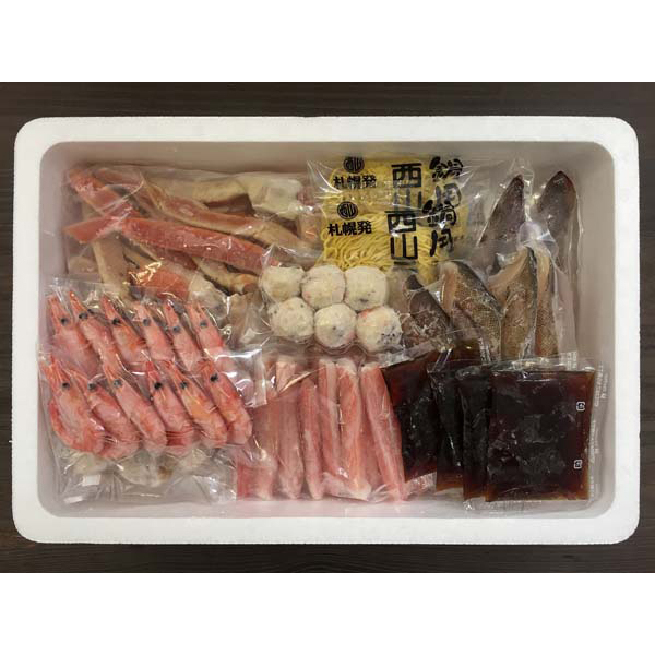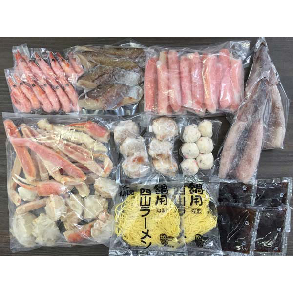 内容:ゆでずわいがにカット600g、生ずわいがに棒ポーション200g、ボイル海老12尾、ボイル帆立6個、かに入つみれ6個、ツボ抜きいか100g×2尾、助宗鱈切身40g×6切、冷凍生ラーメン80g×2玉、たれ(濃縮:醤油仕立て)50ml×4袋
