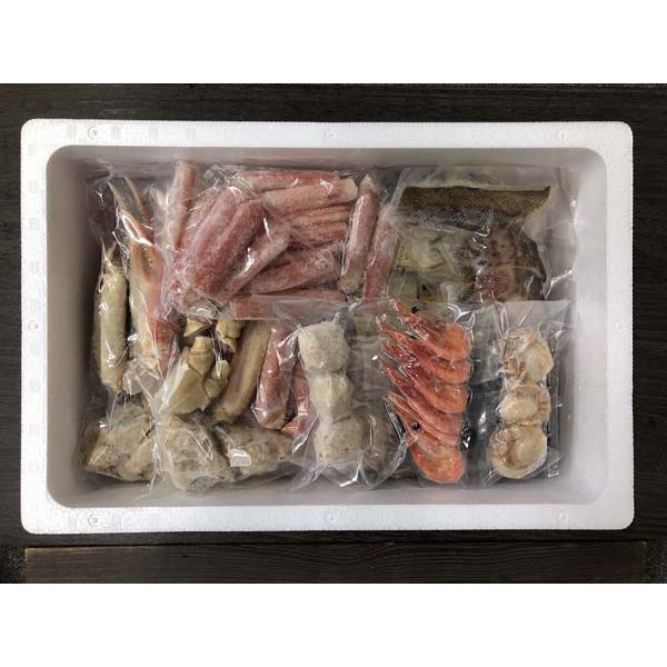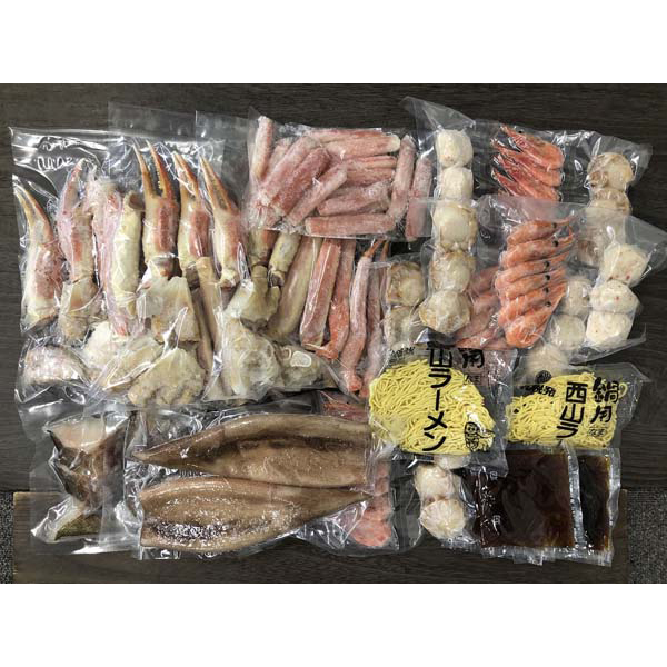 内容:ゆでずわいがにカット400g×3袋、生ずわいがに棒ポーション200g×1袋、ボイル海老24尾、ボイル帆立12個、かに入つみれ12個、ツボ抜きいか100g×2尾、助宗鱈切身40g×6切、冷凍生ラーメン80g×2玉、たれ(濃縮:醤油仕立て)50ml×6袋