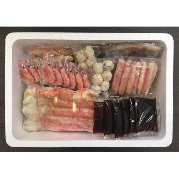内容:ゆでずわいがにカット400g×2、生ずわいがに棒ポーション200g×1、ゆでたらばがにセクション800g×1、ボイル海老×24、ボイル帆立×12、かに入つみれ×12、ツボ抜きいか×2、助宗鱈切身40g×6、冷凍生ラーメン×2、たれ(濃縮:醤油仕立て)50ml×6