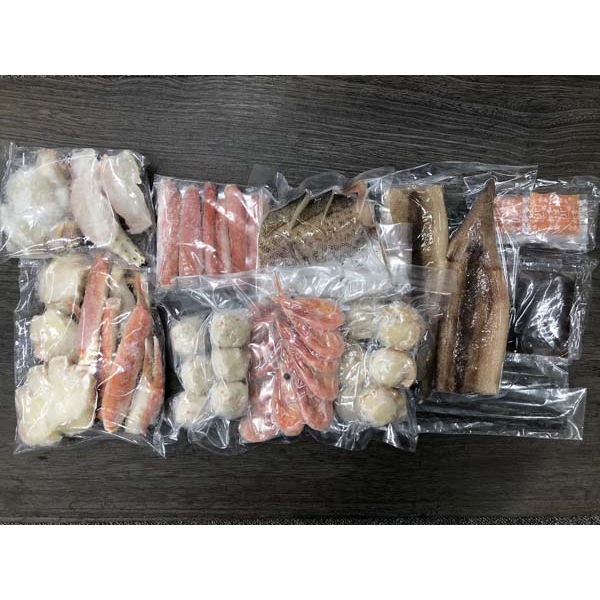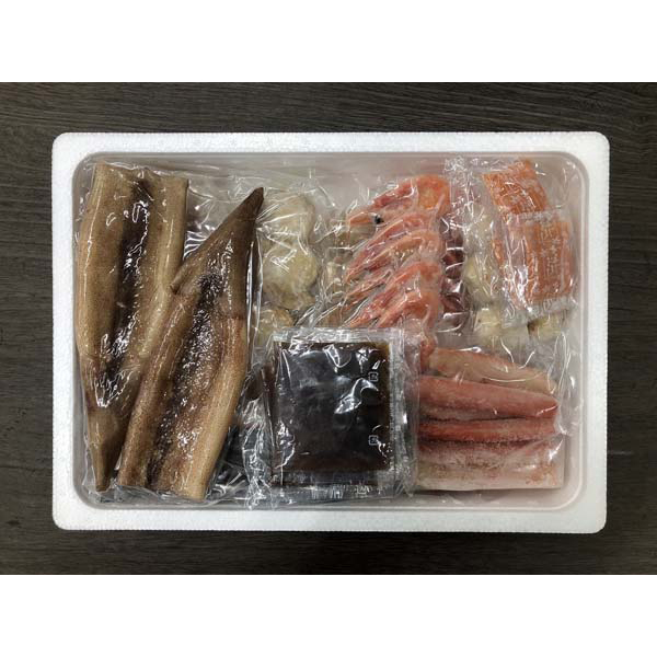 内容:ゆでずわいがにカット300g、生たらばがにカット200g、生ずわいがに棒ポーション100g、ボイル海老×12、ボイル帆立×6、かに入つみれ×6、助宗鱈切身40g×3、ツボ抜きいか100g×2、だし用昆布5g×2、ポン酢たれ30g×4、紅葉おろし10g×4