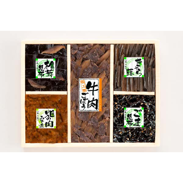 内容:椎茸昆布 50g×1、畑の肉みそ煮 30g×1、牛肉ごぼう 70g×1、きゃら蕗 40g×1、ごま昆布 40g×1