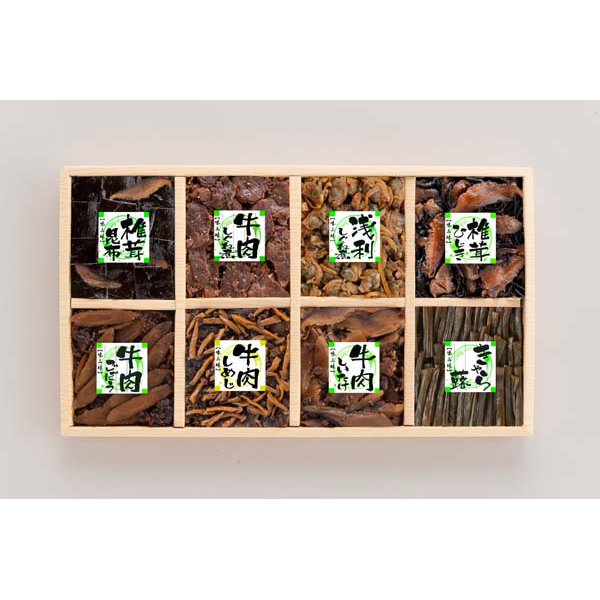 内容:椎茸昆布 60g×1、牛肉しぐれ煮50g×1、浅利しぐれ煮50g×1、椎茸ひじき50g×1、牛肉ごぼう50g×1、牛肉しめじ50g×1、牛肉しいたけ50g×1、きゃら蕗60g×1