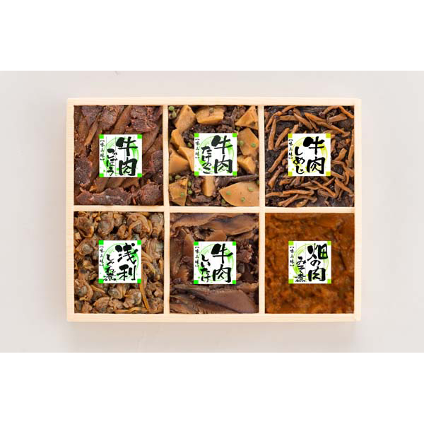 内容:牛肉ごぼう50g×1、牛肉たけのこ60g×1、牛肉しめじ50g×1、牛肉しいたけ50g×1、浅利しぐれ煮50g×1、畑の肉みそ煮50g×1