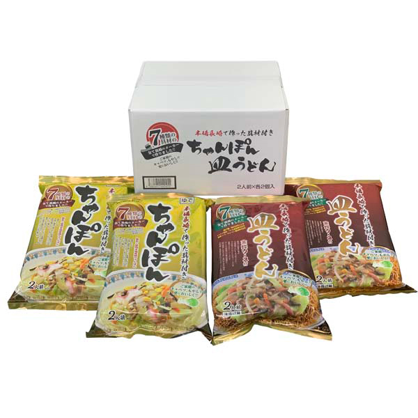 内容:7種の具材本場長崎で作ったちゃんぽん2食(麺140gx2 具材40gx2 液体スープ35.2gx2)x2、7種の具材本場長崎で作った皿うどん2食(具材280g 揚げ麺80g ウスターソース5.9gx2)×2