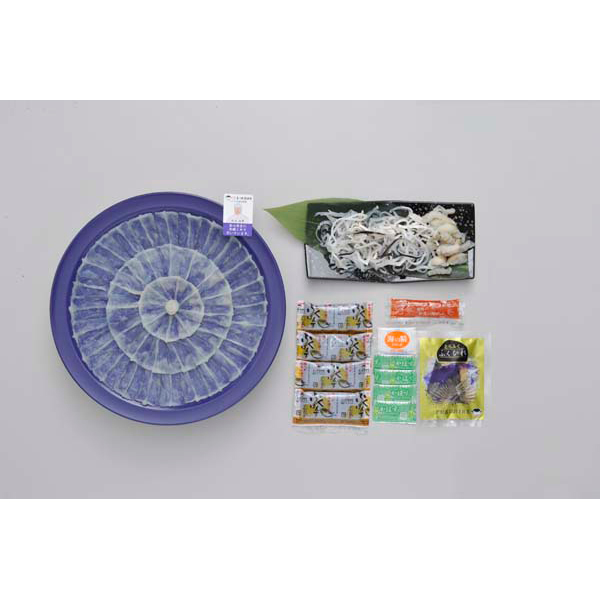 内容:とらふく刺身古式引き135g(プラスチック皿30cm)、とらふく皮120g、ひれ酒用ヒレ5枚、ポン酢35g×4、モミジオロシ16g、塩5g、カボス果汁2ml×4 ※刺身皿のデザインは変わる場合がございます。
