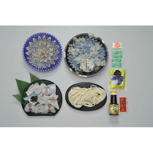 内容:とらふく刺身70g(プラスチック皿25cm)、まふく炙り刺身80g(プラスチック皿22cm)、とらふく皮40g、ふくちり320g(アラ:トラフグ・身:マフグ各160g)、とらふく入りうどん250g、ひれ酒用ヒレ3枚、ポン酢150ml、モミジオロシ16g、塩5g、カボス果汁2ml×4