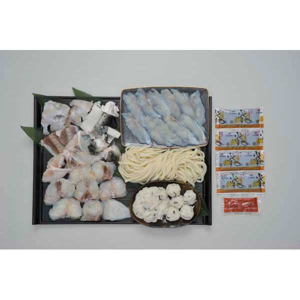 内容:ふくちり500g(アラ:トラフグ・身:マフグ各250g)、とらふぐコラーゲンしゃぶ用皮40g、まふくしゃぶしゃぶ100g、とらふく入りつみれ200g、とらふく入りうどん250g、ポン酢35g×4、モミジオロシ16g