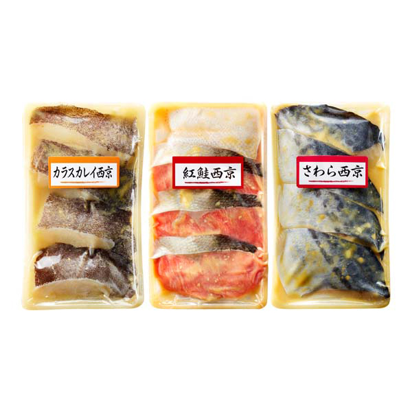 内容:カラスカレイ西京漬4切(計160g)、紅鮭西京漬4切(計160g)、さわら西京漬4切(計160g)