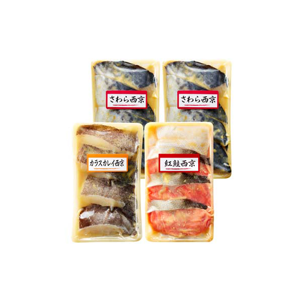 内容:カラスカレイ西京漬4切(計160g)、紅鮭西京漬4切(計160g)×各1、さわら西京漬4切(計160g)×2