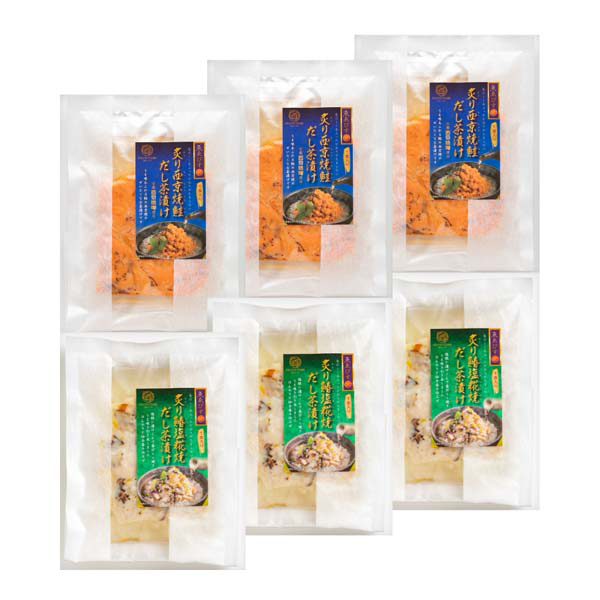 脂の乗った鮭の身を西京焼に仕立てただし茶漬けと、鰆の身を塩糀焼に仕立てただし茶漬けのセットです。それぞれに漬け込む事によって、うま味を引き出すと共に、さらにしっとりと柔らかい食感に仕立てています。ふっくらと焼き上げた身を、炙りを入れて香りも香ばしくする事で、より一層食欲をそそる風味となります。熱々のお出汁をかけて、また夏場の暑い季節には解凍したままの冷たいお出汁をかけて冷やし茶漬けとしても楽しめます。