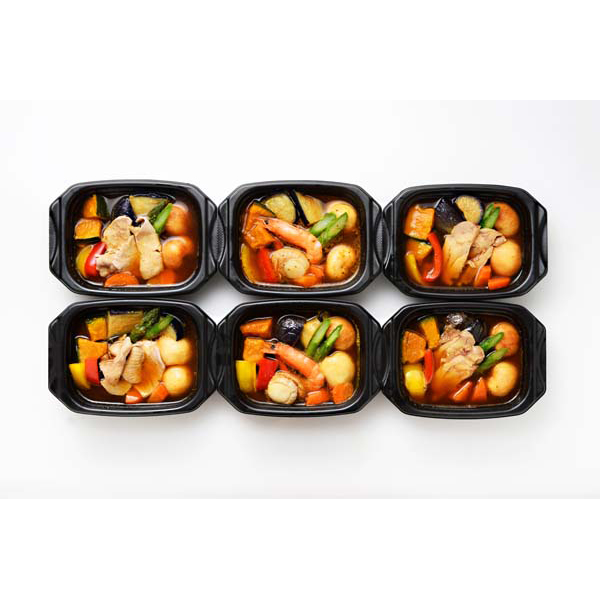 北海道のソウルフード「スープカレー」をご家庭で。チキン、シーフード、ポークの3種のスープカレーをあつあつでお楽しみください。アスパラ、パプリカなどの彩り野菜をトッピングしました。電子レンジで温めるだけの簡単調理です。