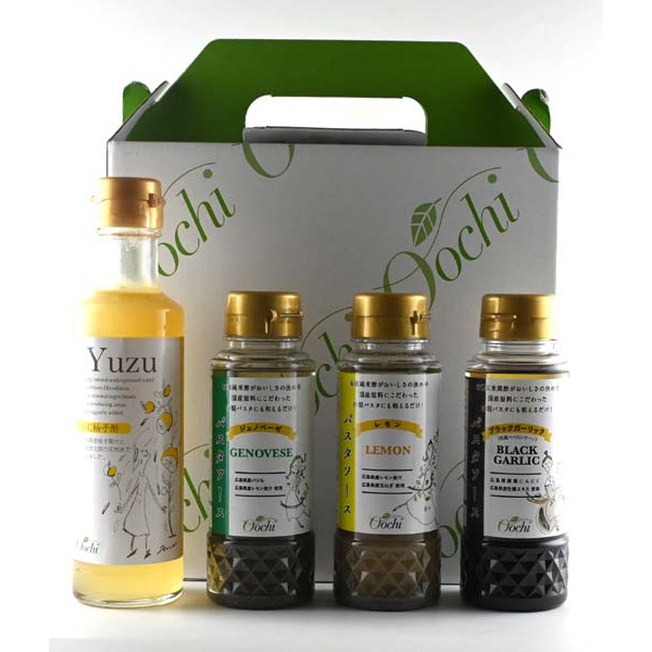 内容:のむ柚子酢200ml、レモンパスタソース170ml、ジェノベーゼパスタソース170ml、ブラックガーリックパスタソース170ml×各1