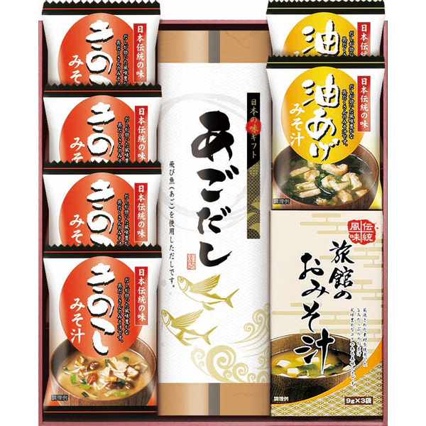 内容:あごだし(6g×4袋入)×1、フリーズドライお味噌汁(油あげ)×2、フリーズドライお味噌汁(きのこ)×4、旅館のおみそ汁×1(9g×3袋入)