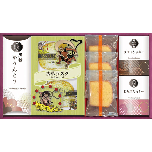 内容:浅草ラスク(プレーン)4枚入×1、黒糖かりんとう×1、カットケーキ(オレンジ)×3、チョコクッキー×1、いちごクッキー×1
