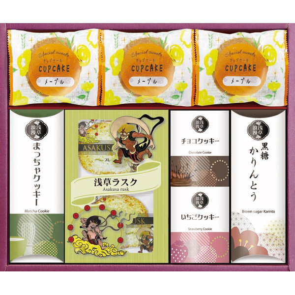 内容:浅草ラスク(プレーン)4枚入×1、黒糖かりんとう×1、カップケーキ(メープル)×3、チョコクッキー×1、いちごクッキー×1、まっちゃクッキー×1