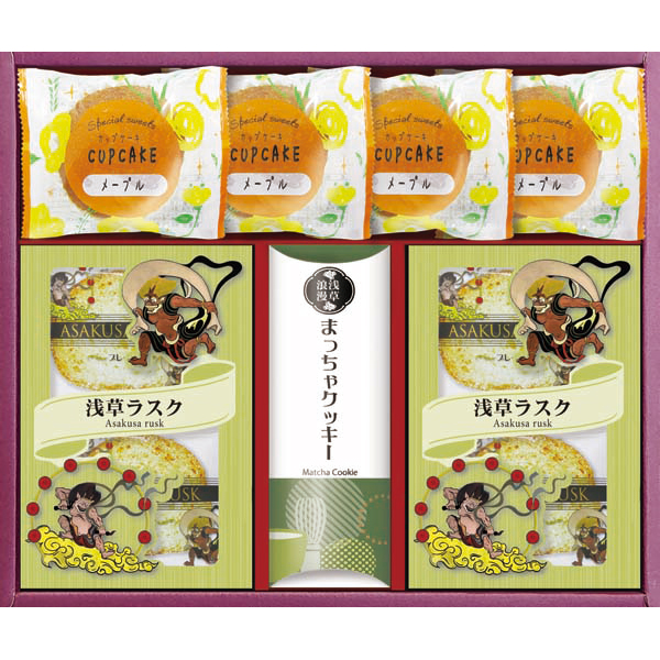 内容:浅草ラスク(プレーン)4枚入×2、カップケーキ(メープル)×4、まっちゃクッキー×1