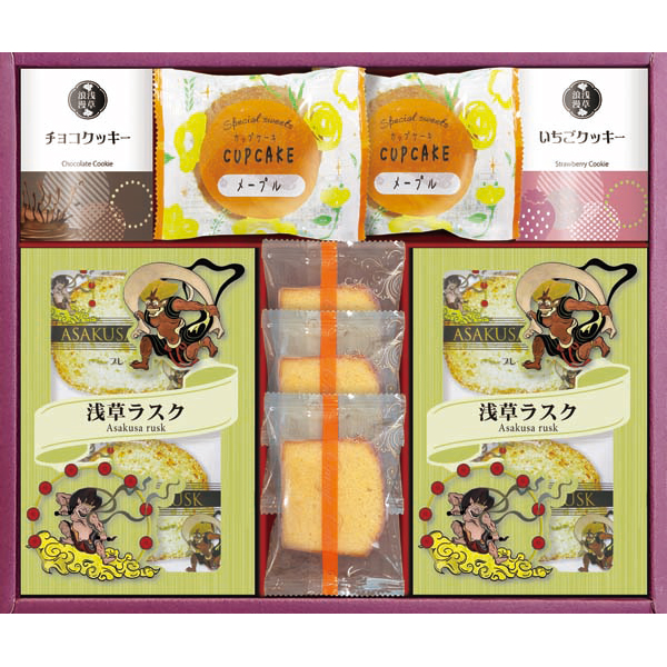 内容:浅草ラスク(プレーン)4枚入×2、カップケーキ(メープル)×2、カットケーキ(オレンジ)×3、いちごクッキー×1、チョコクッキー×1