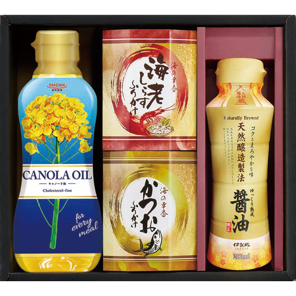 内容:天然醸造醤油200ml×1、キャノーラ油300g×1、かつおふりかけ(2.5g×6袋)×1、海老しらすふりかけ(3g×3袋)×1