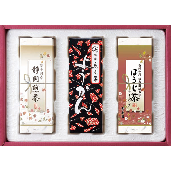 内容:銀座鹿乃子 ようかん200g×1、ほうじ茶ティーバッグ(2g×3袋)×1、静岡煎茶(白)80g×1
