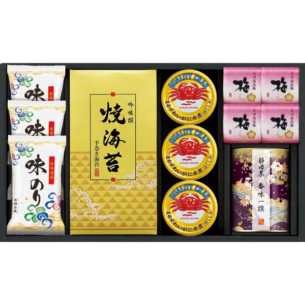 内容:焼海苔半切(5枚×2袋)×1、紀州梅干し1粒×4袋×1、有明海産味のり(8切5枚)×3、静岡煎茶(紫)80g×1、まるずわいがにほぐしみ55g×3