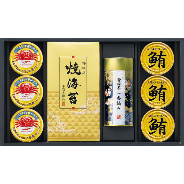 内容:焼海苔半切(5枚×2袋)×1、静岡煎茶(黒)120g×1、まるずわいがにほぐしみ55g×3、鮪油漬フレーク70g×3