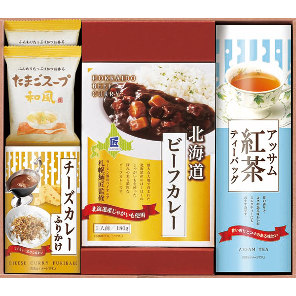 内容:ビーフカレー180g×1、FDたまごスープ(和風)×2、チーズカレーふりかけ(5g×3袋)×1、アッサム紅茶ティーバッグ(2g×3袋)×1
