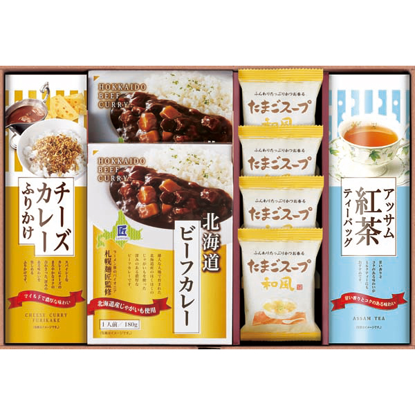 内容:ビーフカレー180g×2、FDたまごスープ(和風)×4、アッサム紅茶ティーバッグ(2g×3袋)×1、チーズカレーふりかけ(5g×4袋)×1