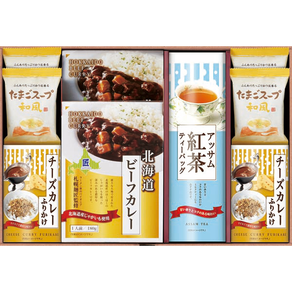 内容:ビーフカレー180g×2、FDたまごスープ(和風)×4、アッサム紅茶ティーバッグ(2g×3袋)×1、チーズカレーふりかけ(5g×3袋)×2