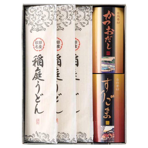 内容:稲庭うどん80g×3、すりごま(8g×2袋)×1、うどんスープの素(8g×2袋)×1、かつおだし(6g×2袋)×1