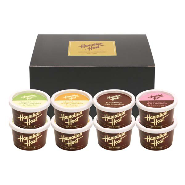 「ハワイアンホースト」の代名詞であるマカダミアナッツのクラッシュを練りこんだミルクチョコアイスと、ミルクとホワイト2種のマカダミアチョコアイスに、相性抜群の3つのフレーバーを組み合わせ、見た目も味も楽しいアイスに仕上げました。