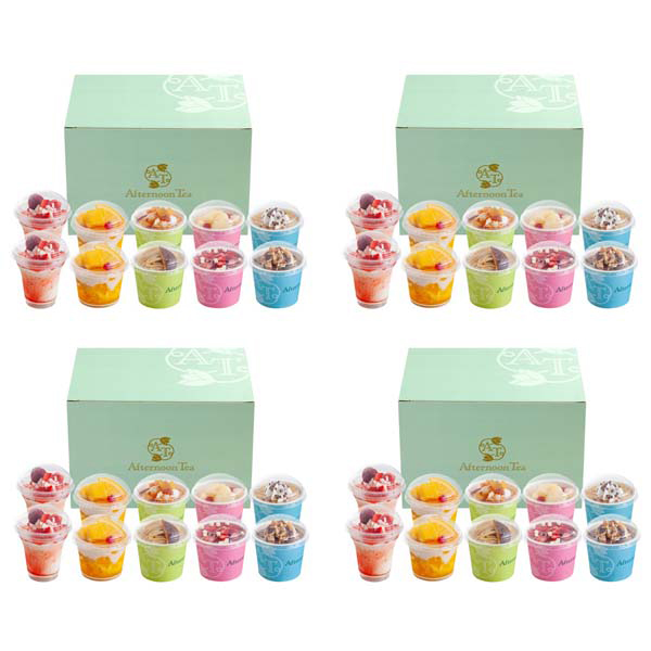 内容:苺のパフェ80ml・スイートフルーツティーパフェ82ml×各8、渋皮栗のモンブラン94ml×4、洋梨とアールグレイ・苺とチーズ・スイートポテト・チョコバナナ・ダブルチョコレート各103ml×各4(計40)