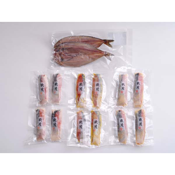 内容:ほっけ(200g×2)×1、秋鮭粕漬切身80g×4、秋鮭西京漬切身80g×4、秋鮭甘味噌漬切身80g×4