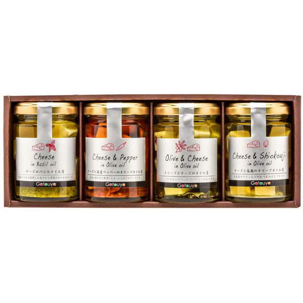 内容:チーズのバジルオイル漬100g×1、チーズと国産ペッパーのオリーブオイル漬100g×1、オリーブとチーズのオイル漬100g×1、チーズと塩麹のオリーブオイル漬100g×1
