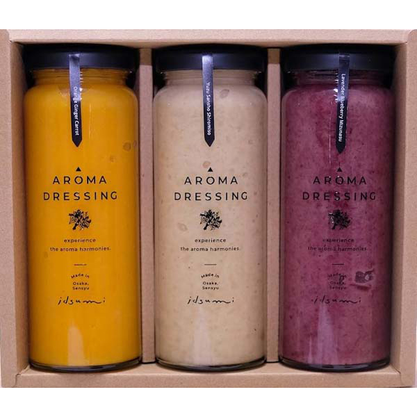 内容:アロマドレッシング(オレンジ&ジンジャー&にんじん)200ml、アロマドレッシング(ゆず&山椒&白みそ)200ml、アロマドレッシング(ラベンダー&ブルーベリー&水なす)200ml×各1本