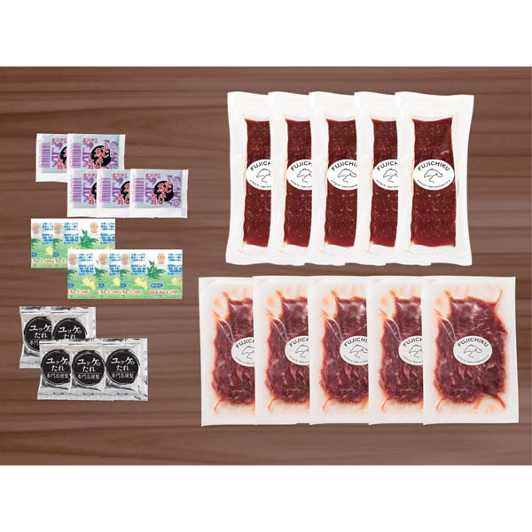 内容:ふじ馬刺し赤身スライスパック40g×5、ふじ馬刺しユッケ50g×5、馬刺しのたれ5ml×5、生姜小袋3g×5、ユッケのたれ10g×5