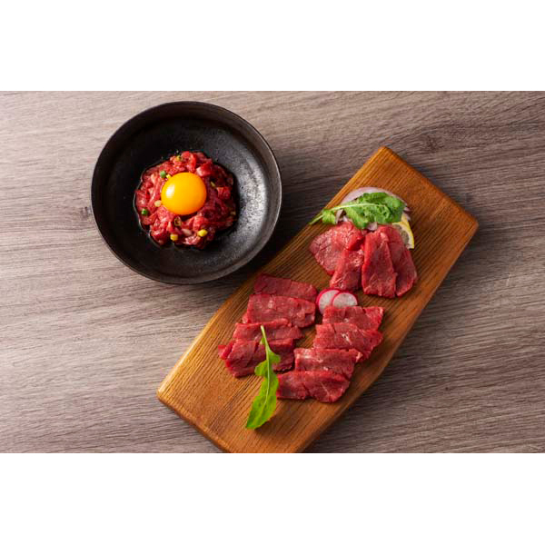 自社牧場育ちの新鮮な馬刺しを産地直送にてお届け致します。もっともポピュラーな赤身肉はモチッとした食感と馬肉本来の旨みを楽しんでいただけます。セットのユッケは今では貴重な一品。馬刺し用の新鮮なお肉を丁寧に刻み仕上げました。馬肉の美味しさを堪能できるセットです。