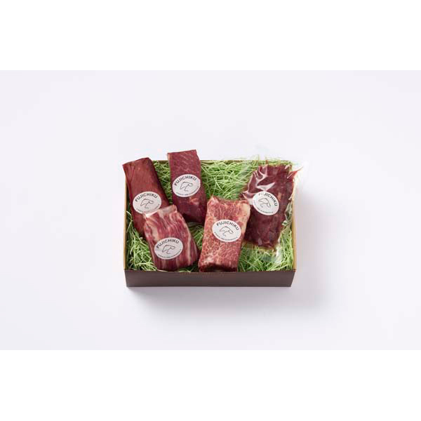 内容:ふじ馬刺しメン(三枚バラ)、大トロ、たたき、上赤身 各80g×各1、ユッケ50g×1、馬刺しのたれ5ml×6、しょうが3g×6、ユッケのたれ10g×1、たたきのたれ20g×1