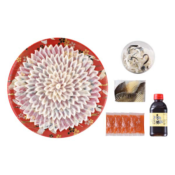 内容:とらふぐ刺身160g、とらふぐ皮60g、ふくポン酢180ml、もみじおろし10g×4、とらふぐヒレ5枚